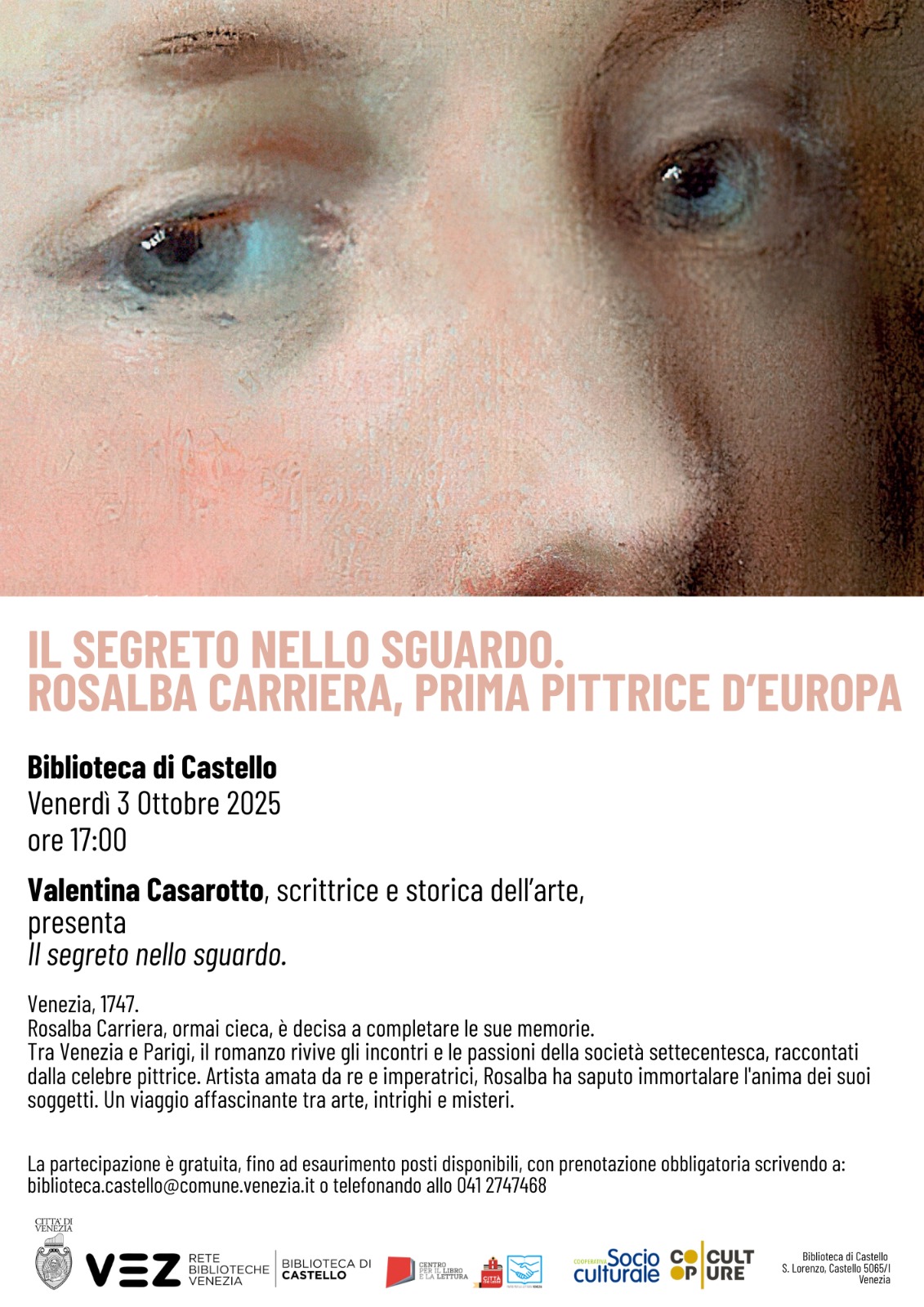 Valentina Casarotto, scrittrice e storica dell'arte vicentina, presenta la nuova edizione del romanzo "Il segreto nello sguardo. Rosalba Carriera prima pittrice d'Europa, Gaspari editore 2025. Venezia, 1747. 𝗥𝗼𝘀𝗮𝗹𝗯𝗮 𝗖𝗮𝗿𝗿𝗶𝗲𝗿𝗮, ormai vecchia e quasi cieca, è risoluta a completare la stesura…
