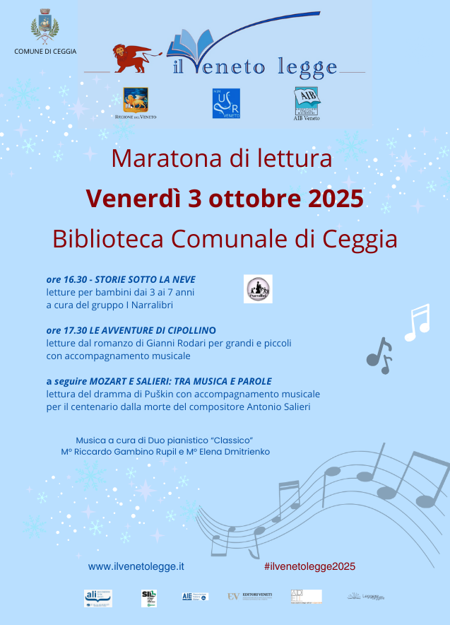 Cari lettori, venerdì 3 ottobre 2025 torna la maratona di lettura regionale “Il Veneto legge”, giunta oramai alla sua nona edizione. La manifestazione, promossa dall’’Assessorato alla cultura della Regione del Veneto, è un’iniziativa di promozione ed educazione alla lettura e…