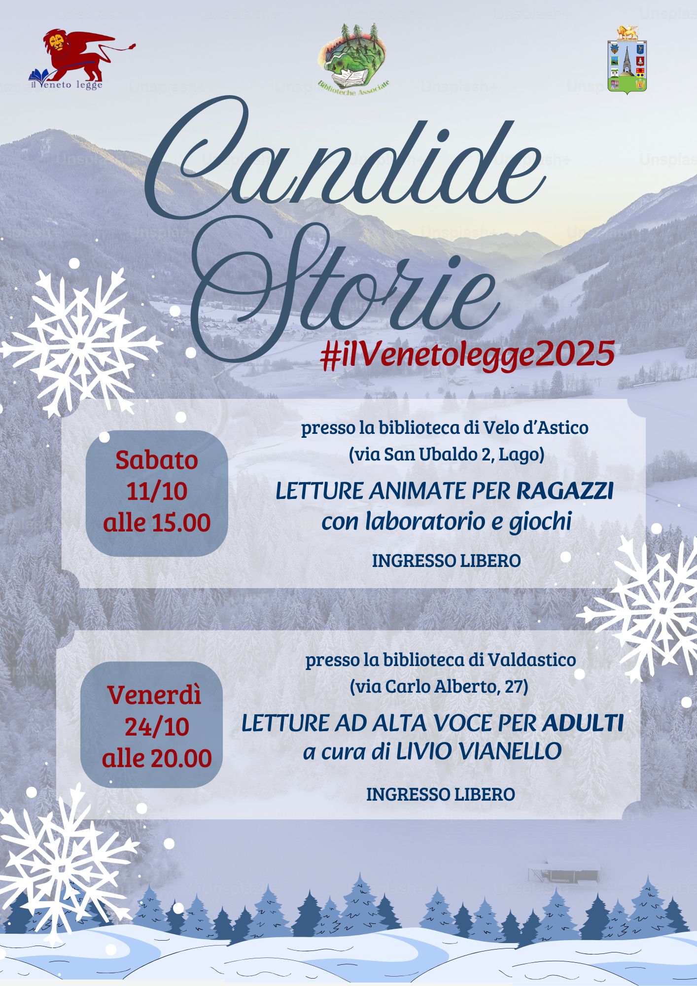 Le biblioteche associate dell'Unione Montana Alto Astico, in occasione dell'iniziativa regionale "Il Veneto Legge" propongono due appuntamenti: 1) il primo dedicato ai bambini sabato 11 ottobre 2025, presso la biblioteca di Velo d'Astico, con letture, laboratori e giochi tutti a…