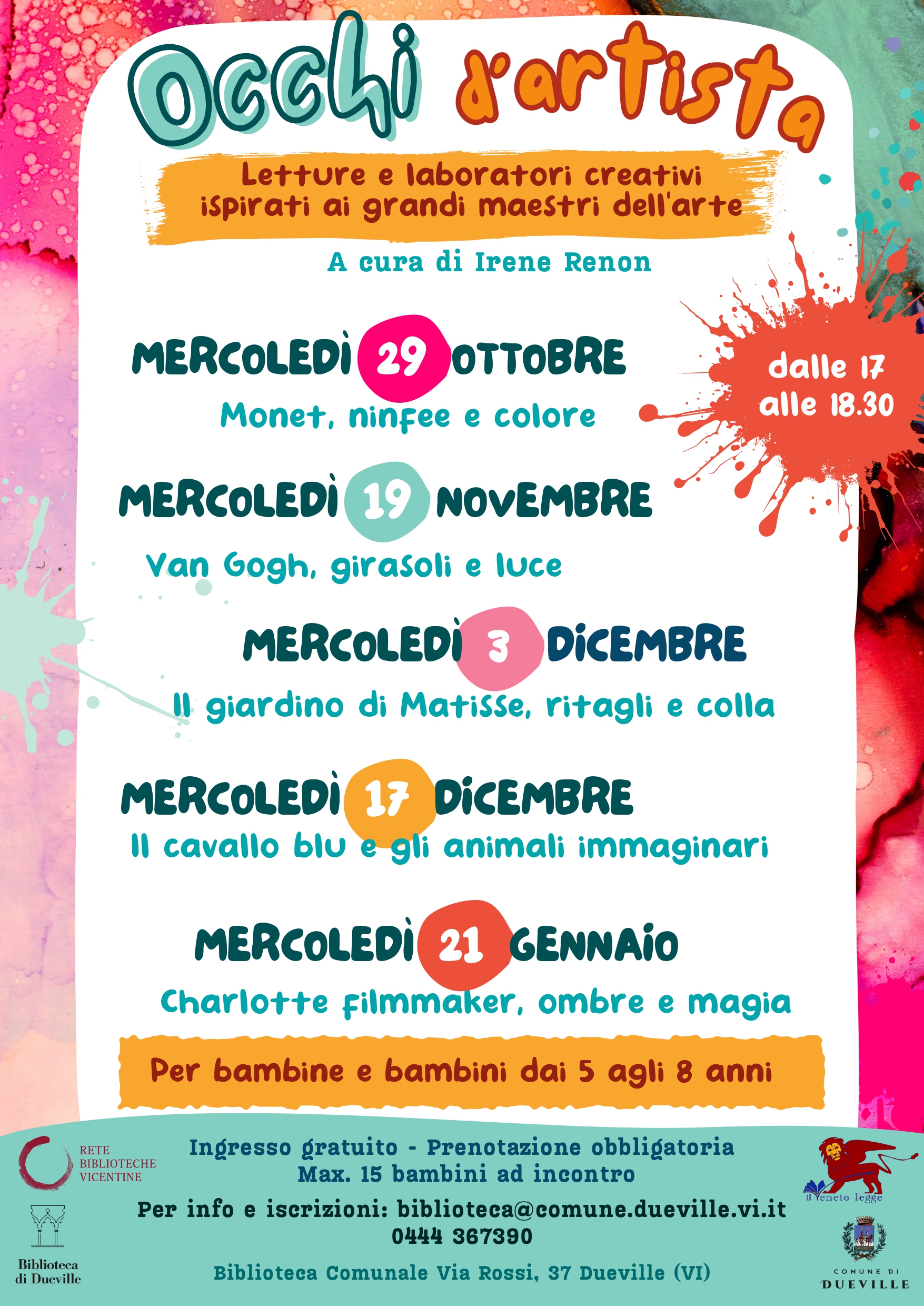 Mercoledì 29 ottobre alle ore 17:00, primo appuntamento con i laboratori di "Occhi d'artista" a cura di Irene Renon: Monet, ninfee e colore. L'attività è dedicata a bambini di età compresa tra i 5 e gli 8 anni. La prenotazione…