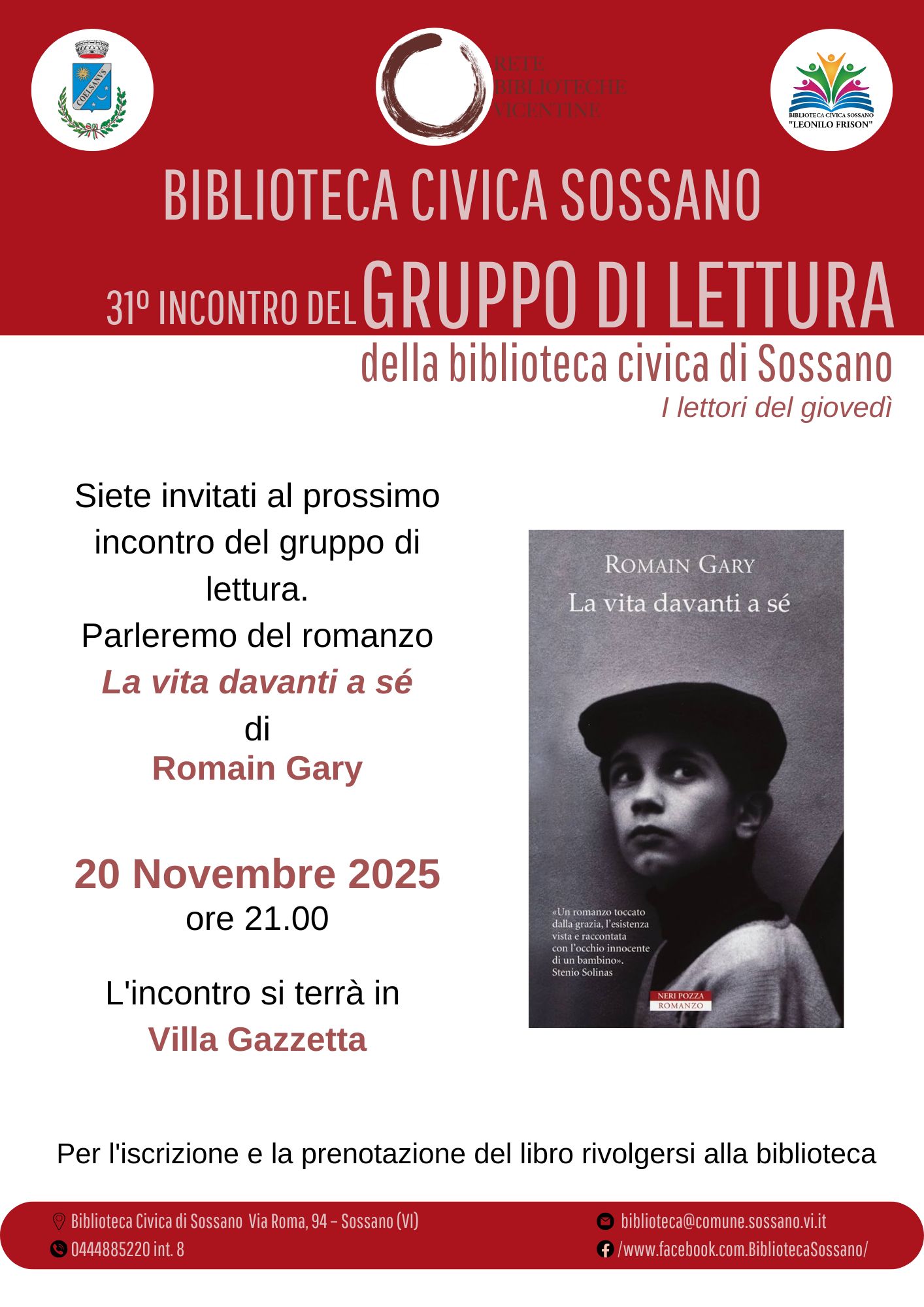 Giovedì 20 Novembre 2025 alle ore 21.00 in Villa Gazzetta, il Gruppo di Lettura di Sossano organizza il suo 31° incontro: si parlerà del romanzo "La vita davanti a sé" di Romain Gary. L'incontro è aperto al pubblico! Per info…