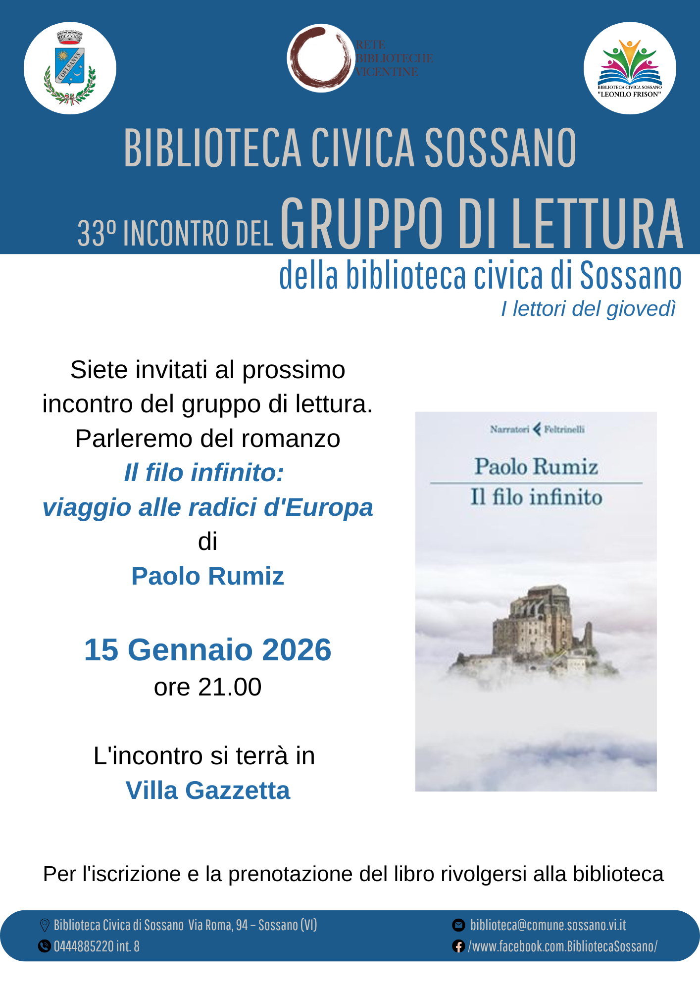 Giovedì 15 Gennaio 2026 alle ore 21.00 in Villa Gazzetta, il Gruppo di Lettura di Sossano organizza il suo 33° incontro: si parlerà del romanzo "Il filo infinito : viaggio alle radici d'Europa" di Paolo Rumiz. L'incontro è aperto al…