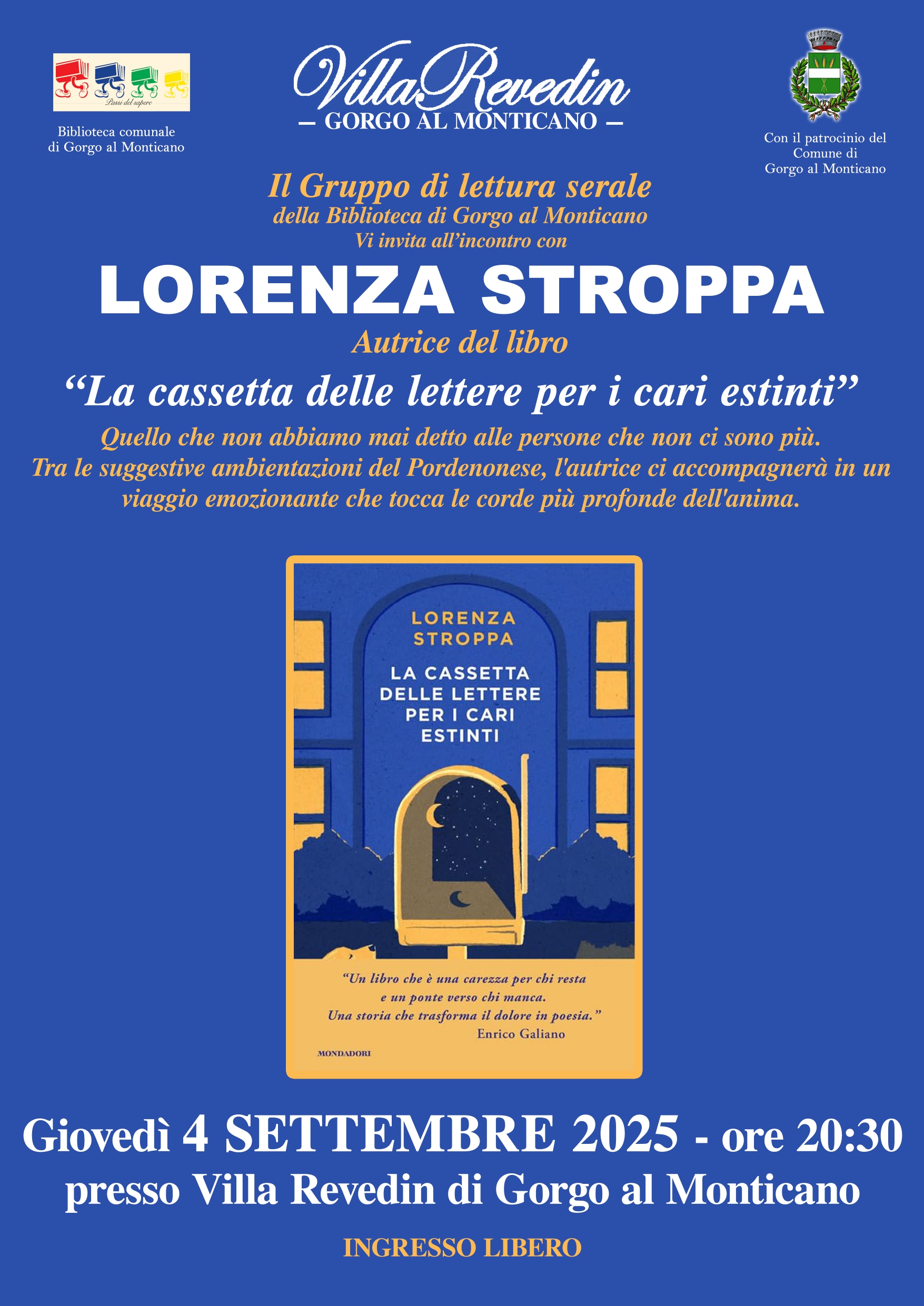 Il Gruppo di lettura serale della Biblioteca di Gorgo al Monticano vi invita all'incontro con Lorenza Stroppa autrice del libro "La cassetta delle lettere per i cari estinti" giovedì 04 settembre 2025 alle ore 20.30 presso Villa Revedin